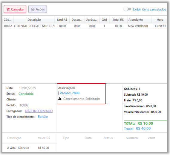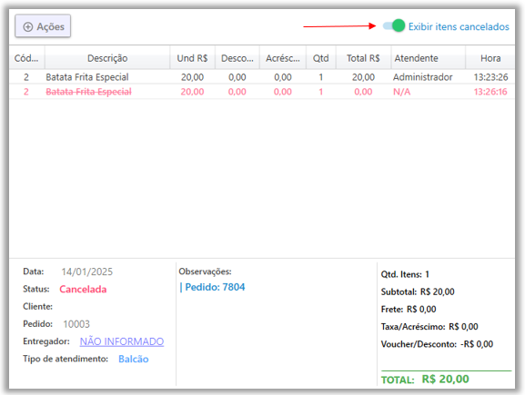 Exibir itens cancelados – Permite visualizar, ou não, os itens que foram cancelados na venda selecionada.