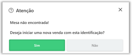 Notificação de Mesa/Comanda inexistente - Ao iniciar uma nova venda do tipo Mesa ou Comanda, com numeração superior ao cadastrado (PDV configurado com 50 mesas e usuário inserindo a mesa 52, por exemplo), o PDV informará ao usuário que a Mesa/Comanda não foi encontrada, orientando a utilizar a numeração informada apenas como identificação de uma venda balcão ou a iniciar uma outra venda.