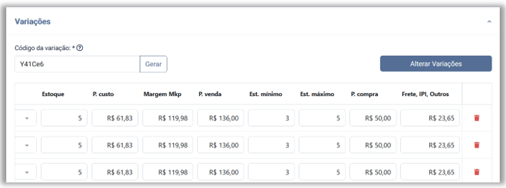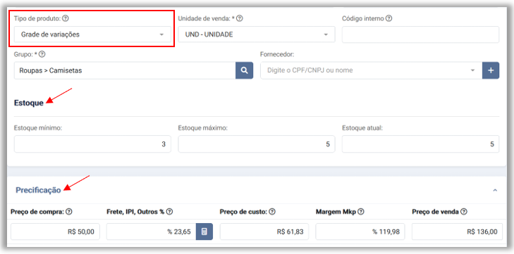 Produtos – Itens do tipo Grade de variações com Estoque e Precificação Os dados inseridos nestes campos serão preenchidos automaticamente na grade de variações.