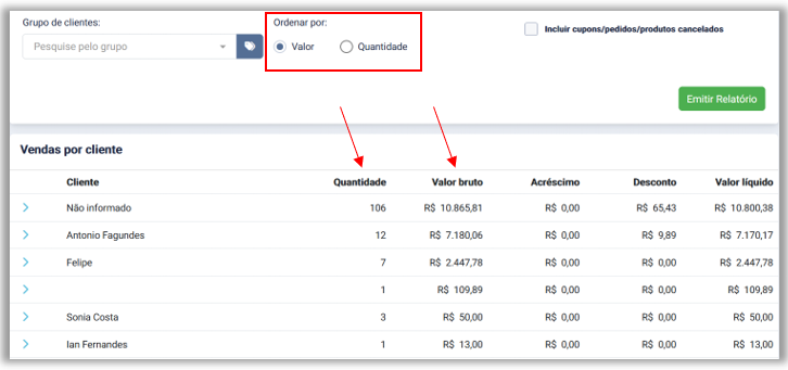 Relatórios – Vendas > Vendas por cliente – Novo parâmetro de pesquisa Ordenar por Valor ou Este filtro muda a exibição da lista de vendas ordenando pelo total vendido ao cliente, selecionando a opção Valor; ou pelo cliente que mais comprou quando ordenado pela Quantidade. Nova coluna Quantidade adicionada na visualização.
