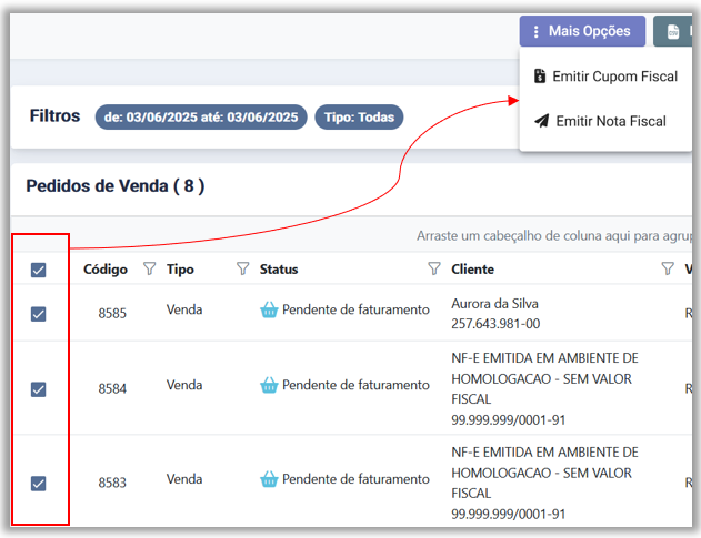 Emissão de notas fiscais em lote – Esta nova funcionalidade permite a emissão de várias notas fiscais, do tipo NF-e ou NFC-e, simultaneamente. Após selecionar as vendas, na parte superior da tela será exibido o menu Mais opções com as funções Emitir cupom fiscal e Emitir nota fiscal. Disponível na tela Vendas > Pedidos de venda.