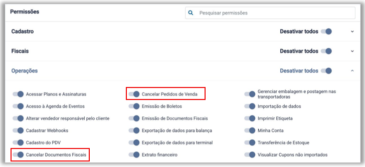 Usuário > Perfil de acesso – Novas opções para controle de acesso do usuário: Cancelar documentos fiscais e Cancelar pedidos de venda na seção Operações. Com estas opções habilitadas, o usuário continua com o comportamento padrão do sistema, sendo possível cancelar documentos fiscais e pedidos de venda/orçamentos. Para restringir o acesso, desabilitar as opções citadas conforme necessidade.