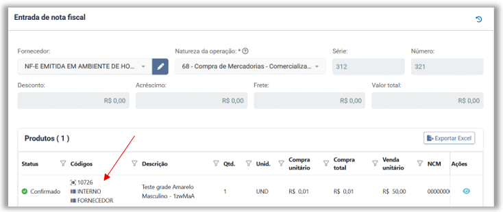 Entrada de nota fiscal – A coluna Códigos também exibirá o código do fornecedor e o código interno, desde que informados no cadastro do item.