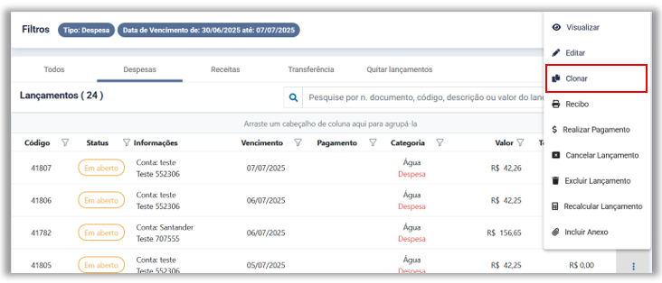 Clonar – Nova função disponibilizada no menu de ações dos lançamentos financeiros. Este recurso replica as informações de uma despesa/receita para cadastrar um novo lançamento, reaproveitando os dados de um lançamento anterior, agilizando o cadastro de novos lançamentos.