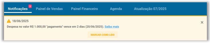 Notificações – A partir desta versão o ERP exibirá notificações no Dashboard quanto a despesas vencidas ou prestes a vencer. Estas notificações serão atualizadas diariamente até que a despesa seja quitada, cancelada ou excluída.