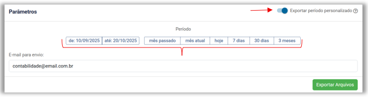 Exportar XML – Novo filtro de busca por Período personalizado, permitindo que o usuário exporte os arquivos XML de um intervalo de tempo específico, diferente do padrão Mês/Ano.