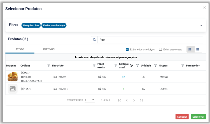 Exportar dados para balança - Novo modal de seleção de itens que permite filtrar e pesquisar pela descrição os produtos que o usuário deseja enviar para atualização na balança.
