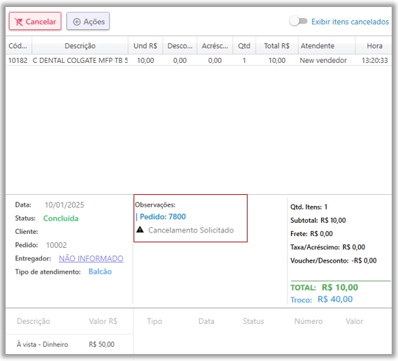 Exibir itens cancelados – Permite visualizar, ou não, os itens que foram cancelados na venda selecionada.
