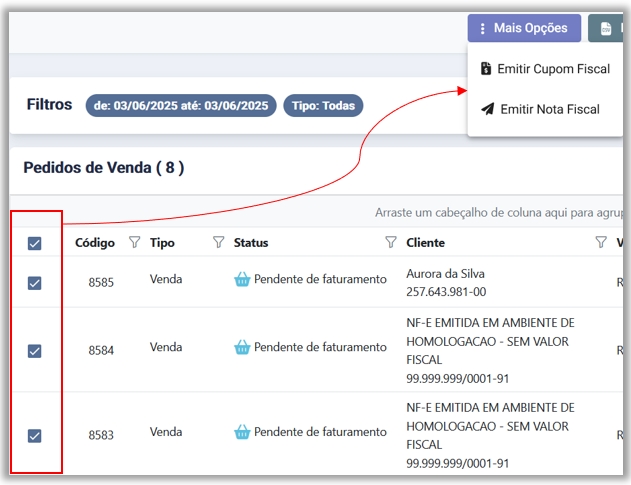 Emissão de notas fiscais em lote – Esta nova funcionalidade permite a emissão de várias notas fiscais, do tipo NF-e ou NFC-e, simultaneamente. Após selecionar as vendas, na parte superior da tela será exibido o menu Mais opções com as funções Emitir cupom fiscal e Emitir nota fiscal. Disponível na tela Vendas > Pedidos de venda.
