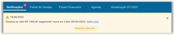 Notificações – A partir desta versão o ERP exibirá notificações no Dashboard quanto a despesas vencidas ou prestes a vencer. Estas notificações serão atualizadas diariamente até que a despesa seja quitada, cancelada ou excluída.