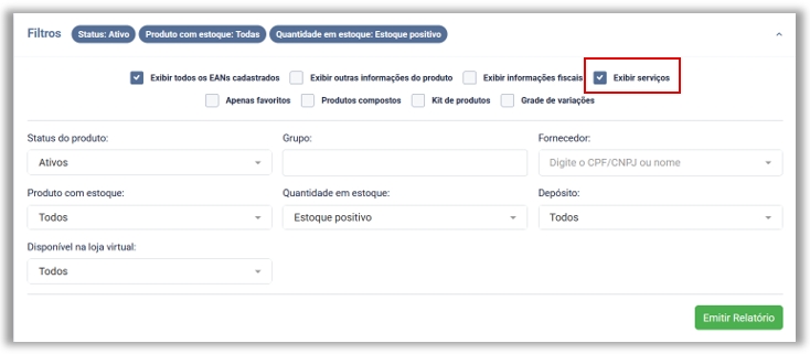 Estoque > Estoque – Novo parâmetro Exibir serviços adicionado aos filtros de pesquisa do relatório de estoque. Habilitando esta função, os serviços serão exibidos na lista junto aos itens pesquisados.