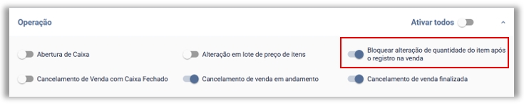 Vendedores > Grupo de operadores – Nova opção de controle de acesso do Operador/Vendedor: Bloquear alteração de quantidade do item após o registro na venda. Com esta opção habilitada, o usuário não poderá alterar a quantidade do item inserido na venda. Se necessário, o PDV solicitará a liberação mediante inserção de Usuário e Senha de operador com o acesso liberado. Apenas para integração com PDV desktop. Não bloqueia acesso no ERP.