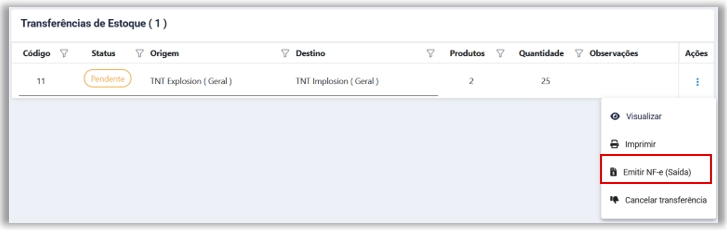 A função Emitir NF-e (Saída) estará disponível após a realização de uma transferência de estoque, tanto com status Pendente quanto Finalizada, não sendo mais necessário que a filial confirme a transferência para que a nota seja emitida.
