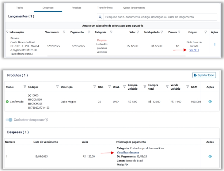 Link de visualização da nota fiscal de entrada disponibilizado na tela Lançamentos e na seção Despesas da visualização da nota fiscal, facilitando a navegação do usuário.